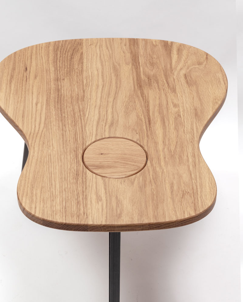 Als alles mogelijk is, welk hout zou u kiezen voor uw gitaartafel? Precies! Daarom zijn alle tafelbladen gemaakt van massief eiken. Europees eiken. Stevig, duurzaam en het ziet er prachtig uit. We hebben een constructietechniek toegepast die de sterkte vergroot en kromtrekken voorkomt. In combinatie met de organische gitaarcontour vormt dit een stijlvol en levendig ontwerp.