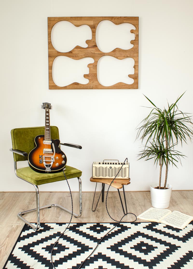 Om de uitstraling en het ultieme gitaargevoel te behouden heeft het tafelblad de werkelijke gitaarafmeting. We hebben het hout behandeld met natuurlijke houtolie (zonder oplosmiddelen), zodat de rijke kleur, structuur en houtnerf van het hout optimaal naar voren komt. Door de combinatie van de gitaarvorm en de rechte metalen poten past deze bijzettafel in nagenoeg ieder interieur en elke muziekstudio. De tafel is een unieke blikvanger!